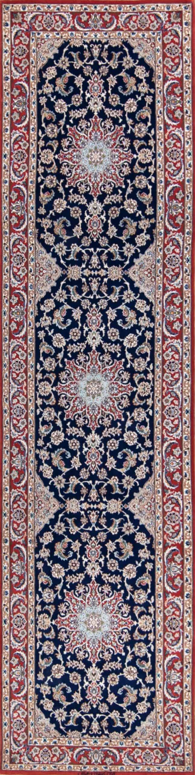 The deep navy blue field hosts radiant central medallions surrounded by delicate floral motifs, scrolling arabesques, and symmetrical palmettes. The ornate red border frames the design with vibrant contrast, making this luxury, narrow Persian carpet a captivating focal point for any interior.