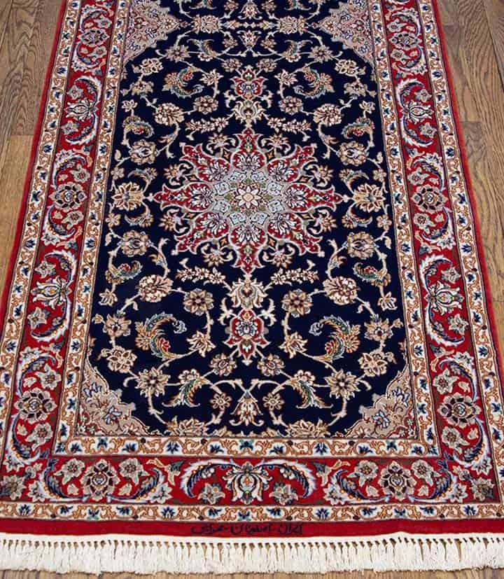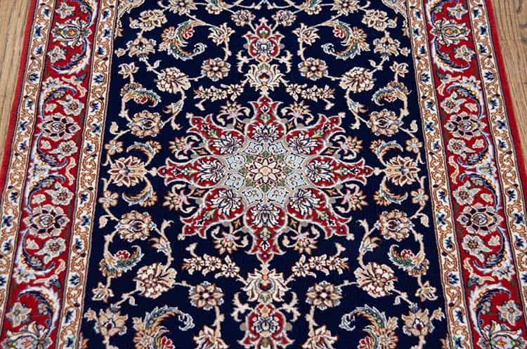 • Design: Persian Isfahan silk runner with floral and medallion motif in navy, red, and ivory