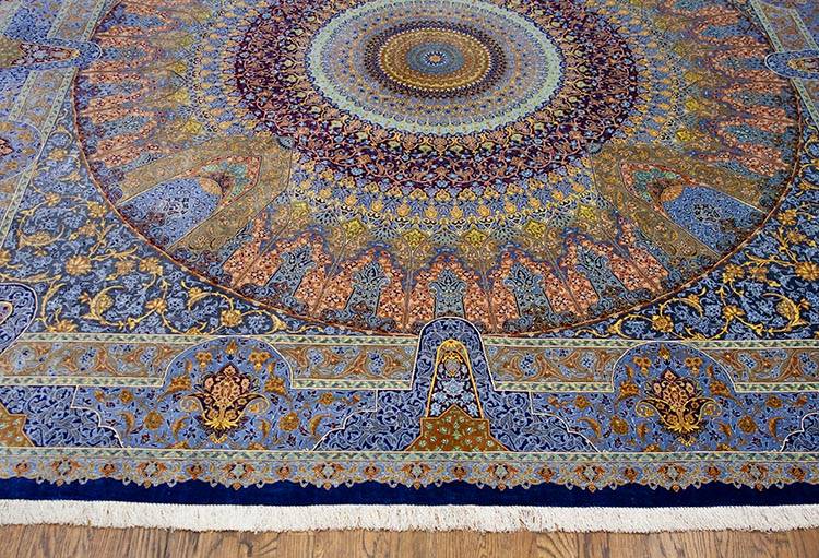 Master weavers create this rug in the refined tradition of classic Qum style rugs. Extremely fine knotting produces remarkable clarity and luminous silk sheen.