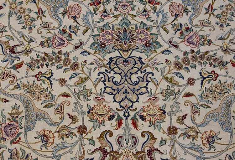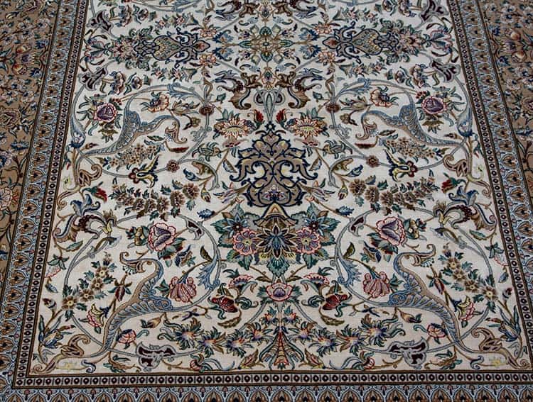 The intricate pattern of this Persian Isfahan rug is nothing short of breathtaking, with its harmonious combination of beige, off-white, blue, taupe, gray-blue, rose, brown, green, and yellow hues. Each color is thoughtfully woven into the fabric, creating a mesmerizing visual display that adds depth and character to the rug.