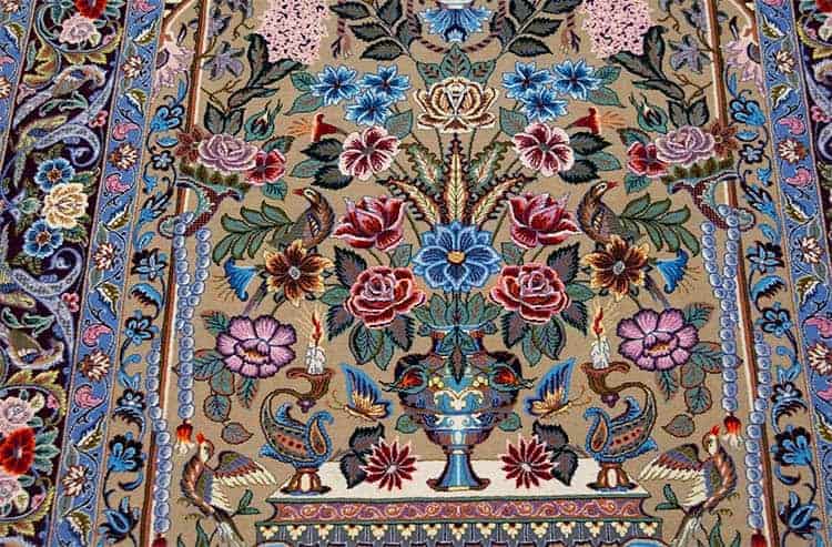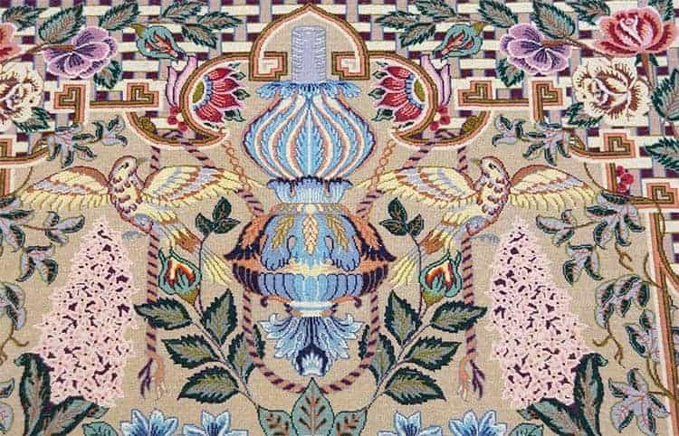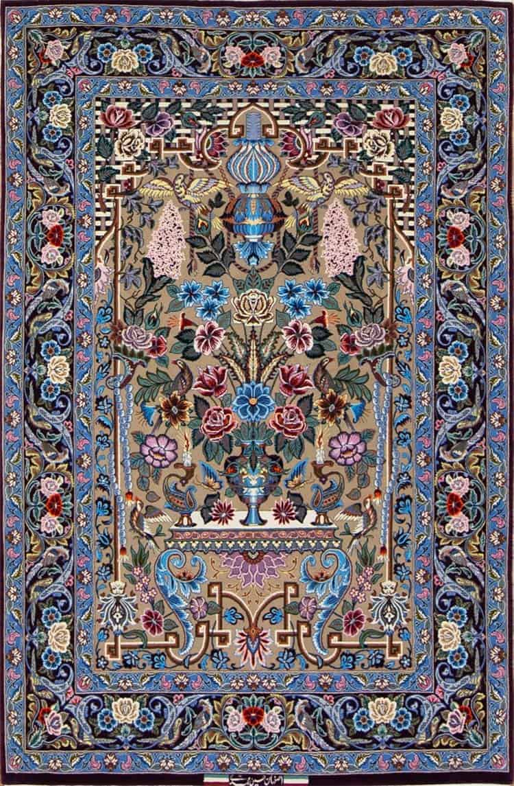 This elegant Persian rug features a truly mesmerizing pattern that tells a story through its intricate design. The centerpiece showcases an elegant arch adorned with a vase filled with vibrant flowers resting on a delicately designed table. Complementing this beautiful arrangement is a charming lantern that hangs gracefully from the arch, surrounded by an enchanting ensemble of singing birds that flit about the primary field and the borders of the rug.