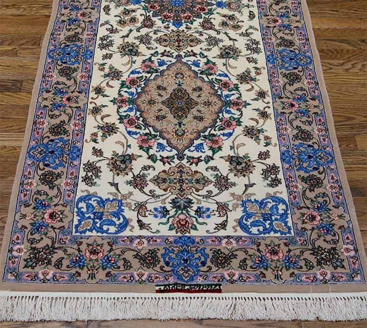 Whether placed in the foyer, alongside kitchen bedsides, on staircases, or in other transitional spaces, a runner rug serves a functional purpose while also being an intentional design element. Let’s take a closer look at a standout option: our featured hallway runner rug for dark hallway is explicitly tailored for dark hallways. This exquisite piece is a high-quality handmade Persian Isfahan rug crafted from a luxurious blend of kork wool and silk, resting on a silk foundation. The craftsmanship that goes into creating this rug is remarkable, highlighting the skill and artistry of Mehrabi, a renowned producer of Isfahan rugs known for their intricate designs and high-quality materials.