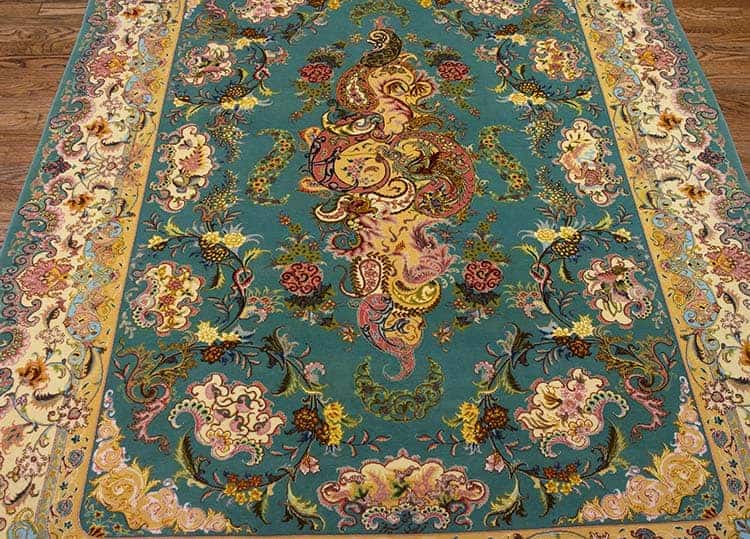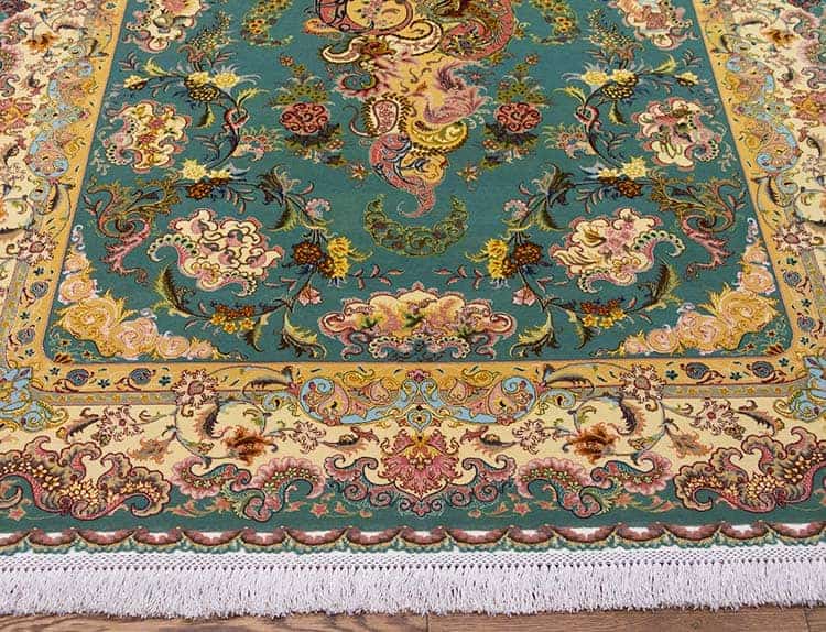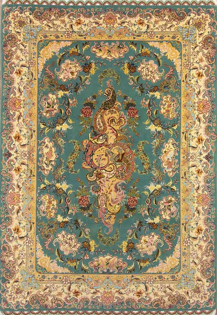 Handmade Persian Rug, Persian Tabriz Shir Far Rug with Teal Green and Rose Colors Made of Fine Quality Kork Wool and Silk on Silk Foundation