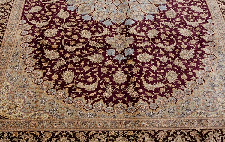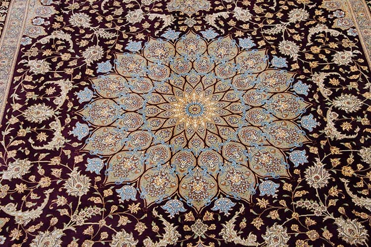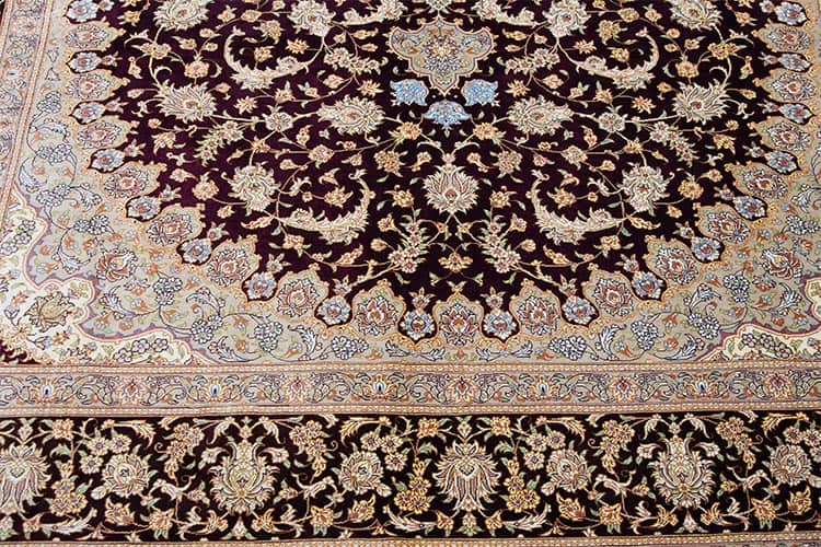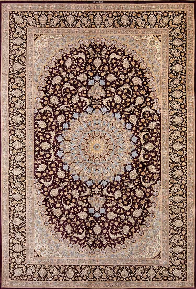 Our featured rug is a labor of love, handmade from 100% pure silk pile on a silk foundation. This combination not only provides durability but also ensures a soft, sumptuous feel that’s undeniably luxurious. At the heart of this luxury art lies a magnificently decorated round-shaped center medallion, which is arguably the showstopper of the design. Its medallion features an extraordinary blend of colors, accentuated by a unique shade of blue that positively stands out against the deep, rich purple backdrop.