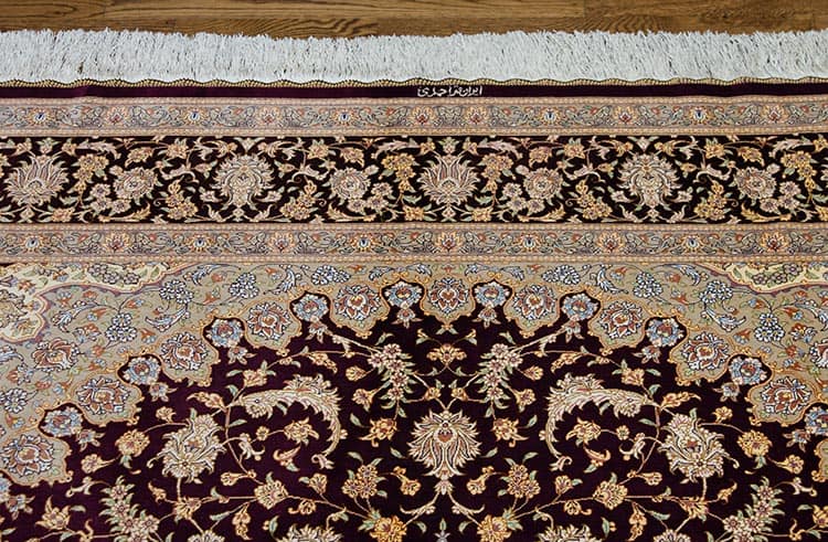 One of the finest examples of this luxurious aesthetic is our elegant purple area rug, a breathtaking pure silk Persian Qum rug. This piece is not just a floor covering; it is an exquisite work of art. Crafted with meticulous attention to detail, it anchors itself firmly in the realm of luxury and top-notch quality. The renowned Ahmadi, a distinguished producer of Persian Qum silk area rugs, has brought life to this splendid creation, showcasing his expert craftsmanship and dedication to creating timeless pieces.