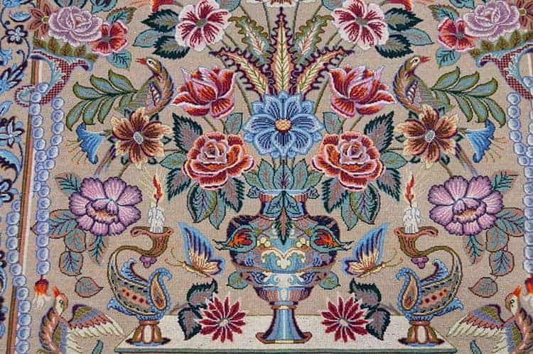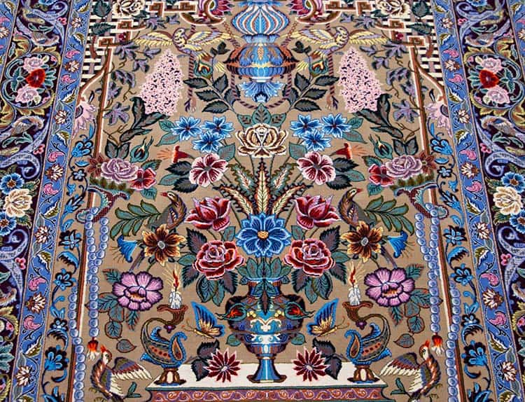The centerpiece of this remarkable rug features a captivating floral arch design, showcasing a mesmerizing scene of a vase of flowers on a table encircled by an array of beautiful roses, hyacinths, singing birds, and butterflies. The intricate border is adorned with elaborate floral motifs and charming birds, adding to the overall allure of the piece.