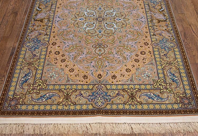 It’s worth noting that this particular rug is a one-of-a-kind creation, made as a pair and exclusively available in our Chicago Persian rug gallery, Beautiful Rugs. Whether you’re an avid collector or someone looking to add a touch of luxury to your home, this rare vegetable-dye silk Persian rug is a timeless piece that embodies the rich tradition and artistry of Iranian rug weaving. The rug size is 4.4×6.6.