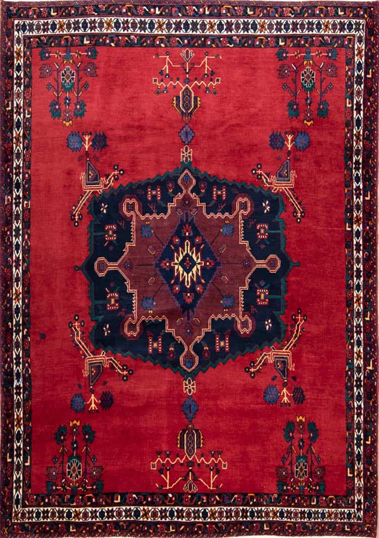 Woven from fine, high-quality Persian wool, this handmade wool rug offers exceptional softness and durability. The rich red field contrasts elegantly with a deep navy medallion, bordered by structured geometric motifs — hallmarks of Sirjan tribal design. Each pattern is balanced and harmonious, revealing the precision and cultural depth that define a traditional Persian rug.